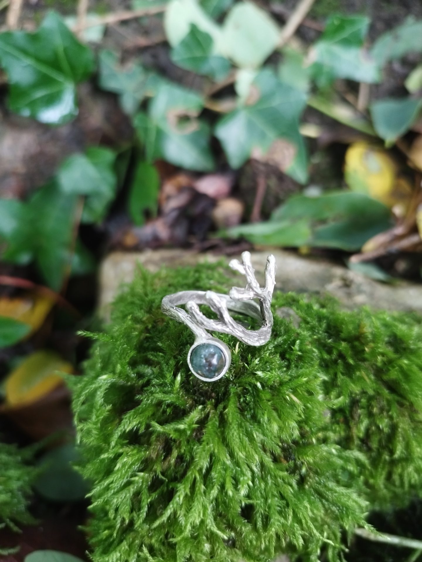Voici la bague branche, avec un petit cabochon en agate mousse tout en nuances de vert.