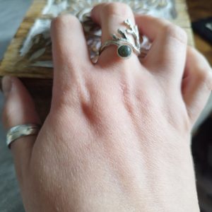 L’anneau de la bague forme une branche, qui encadrent un cabochon central rond en agate mousse (6 mm) ou autre sur commande.