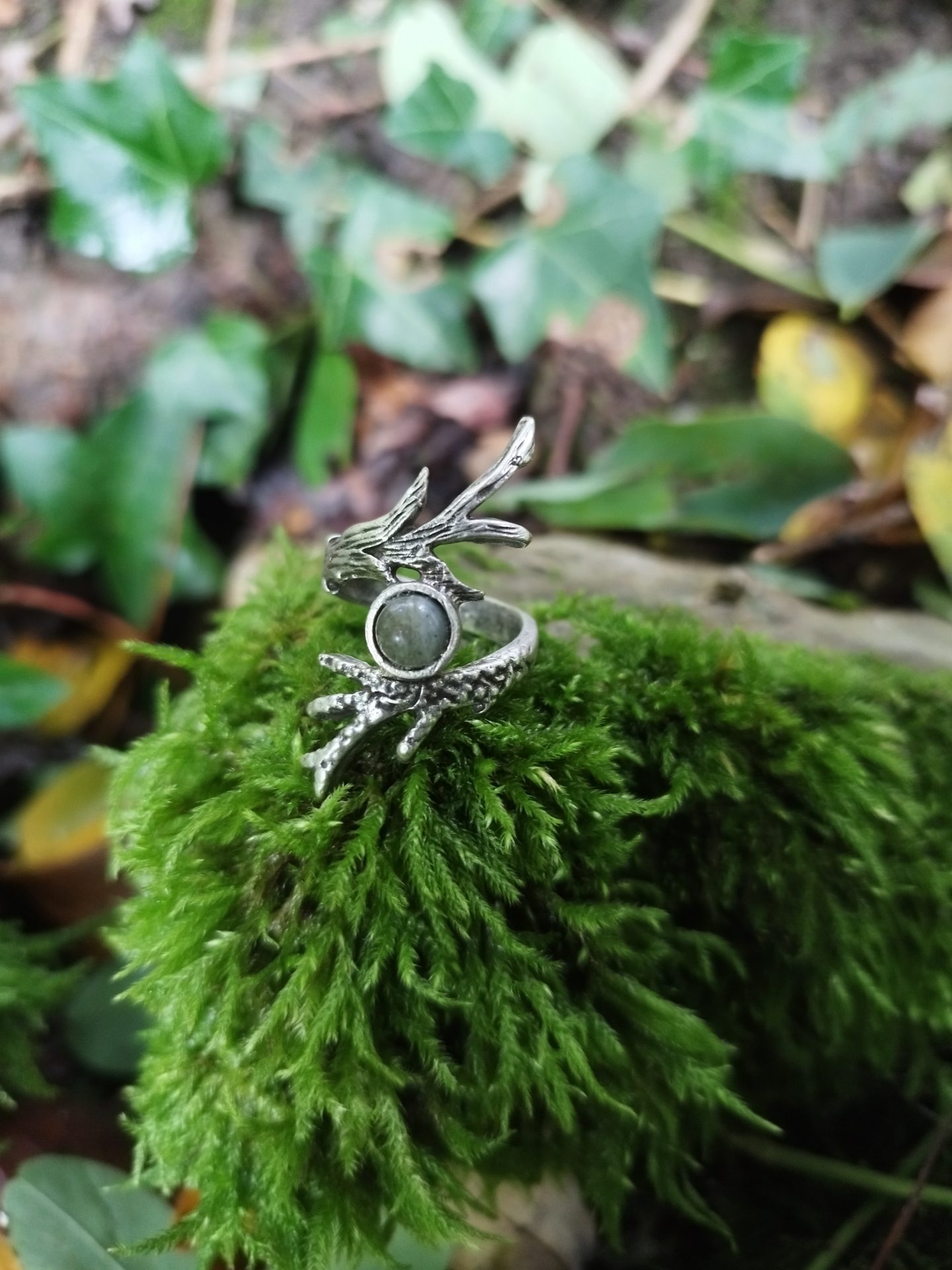 Voici la bague branches, avec un petit cabochon en labradorite.