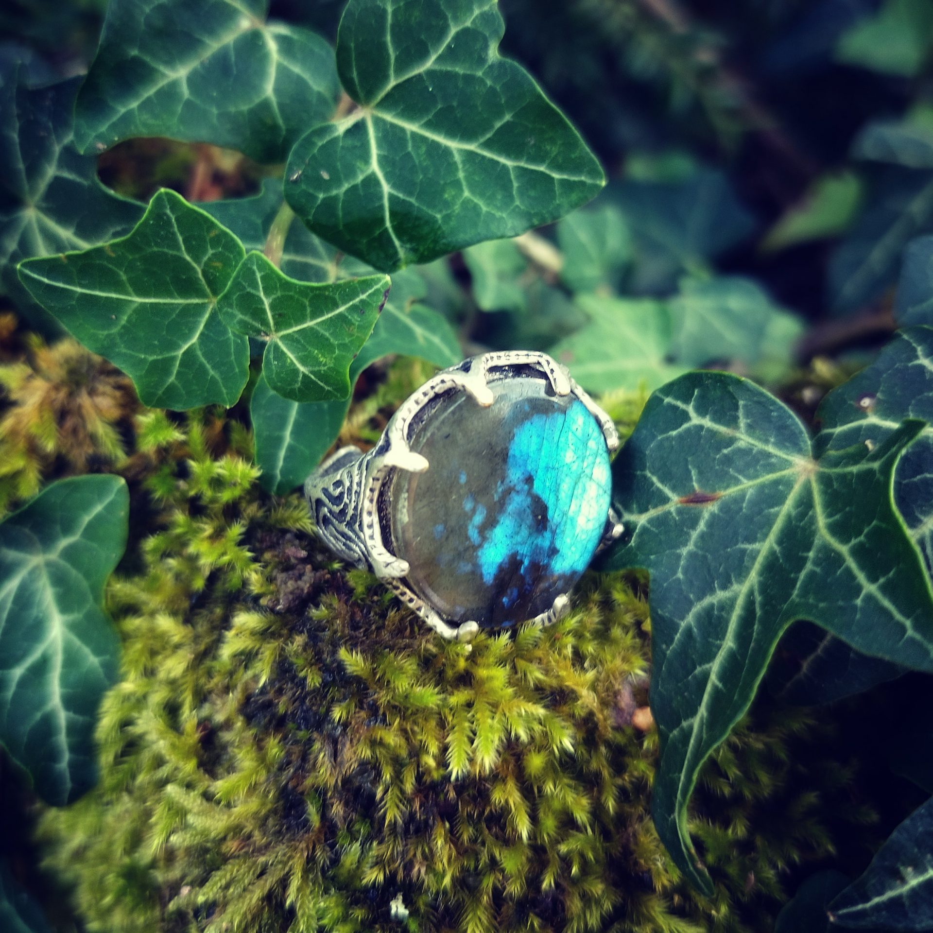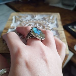 Bague aux motifs de racines formant un chemin, avec des griffes retenant un grand cabochon central rond en labradorite ou onyx (diamètre 20 mm) ou autre sur commande.