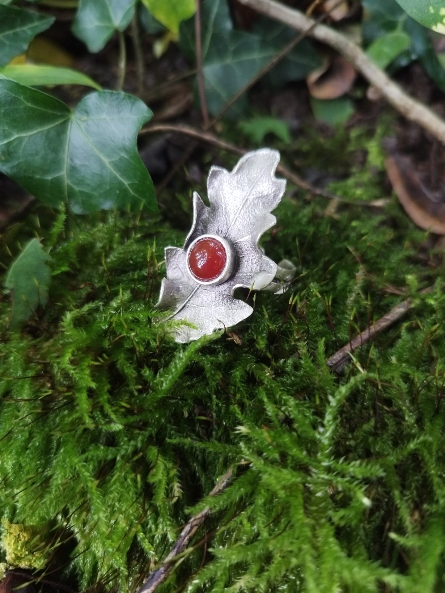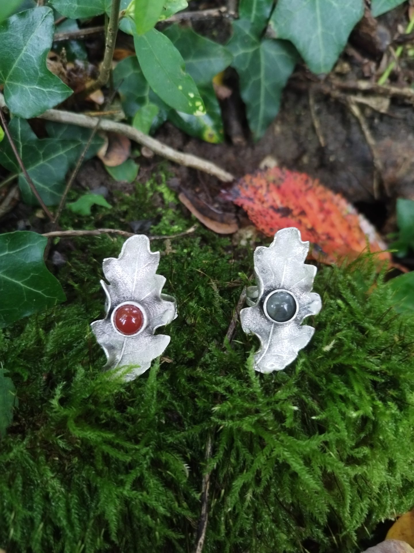 Voici la douce bague Feuille de chêne avec un cabochon en labradorite ou cornaline , qui fait ressentir l’ambiance automnale qui tombe sur la forêt endormie.