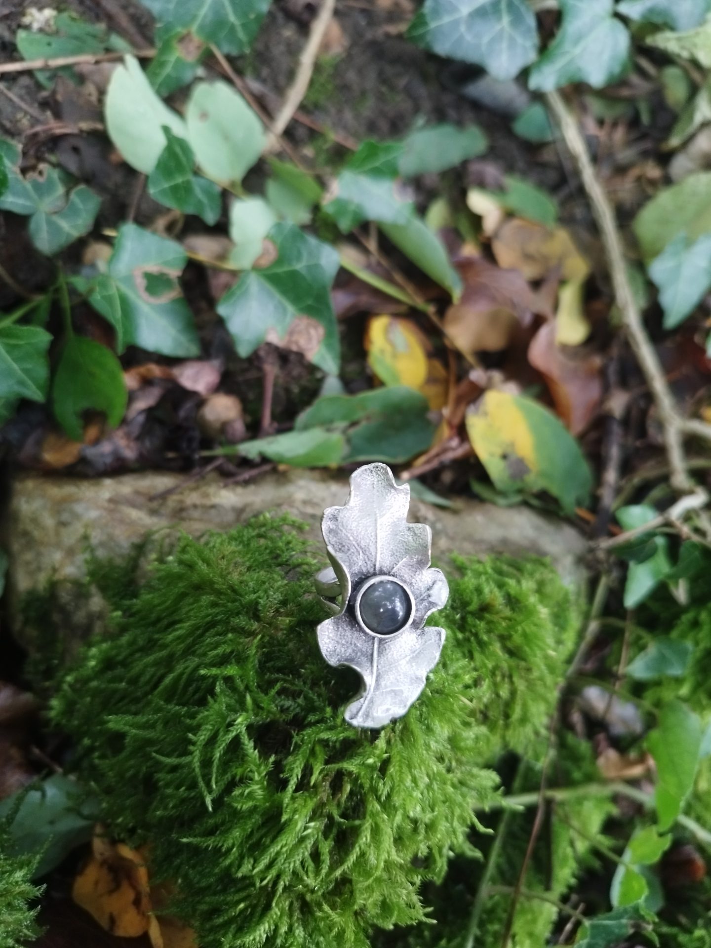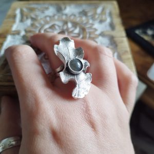 Voici la bague Feuille de Chêne, assez imposante avec un cabochon central de 6mm (labradorite ou ).