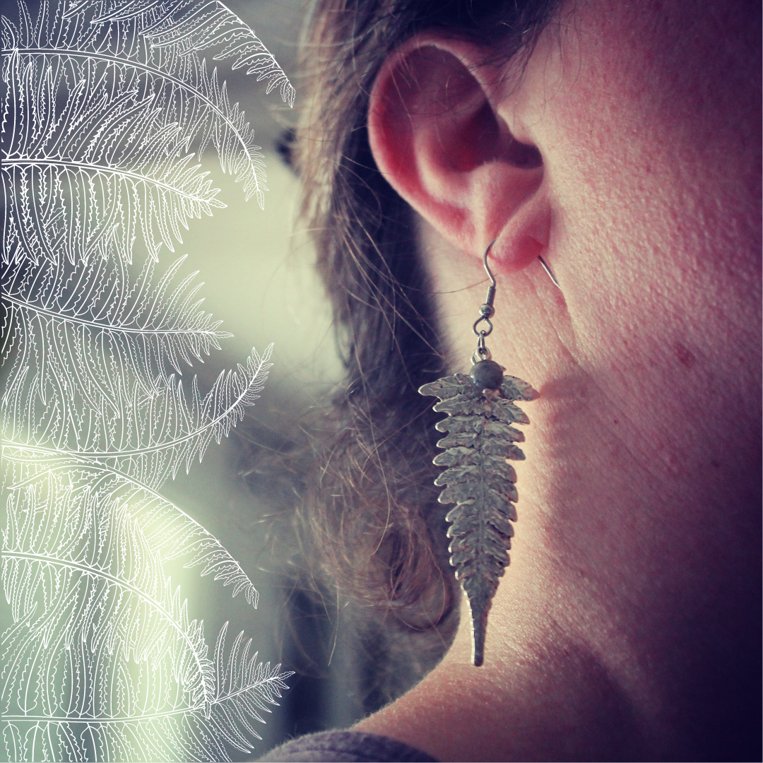 Voici les boucles d’oreilles Fougère, plante que l’on retrouve dans plusieurs légendes comme offrande par les fées.