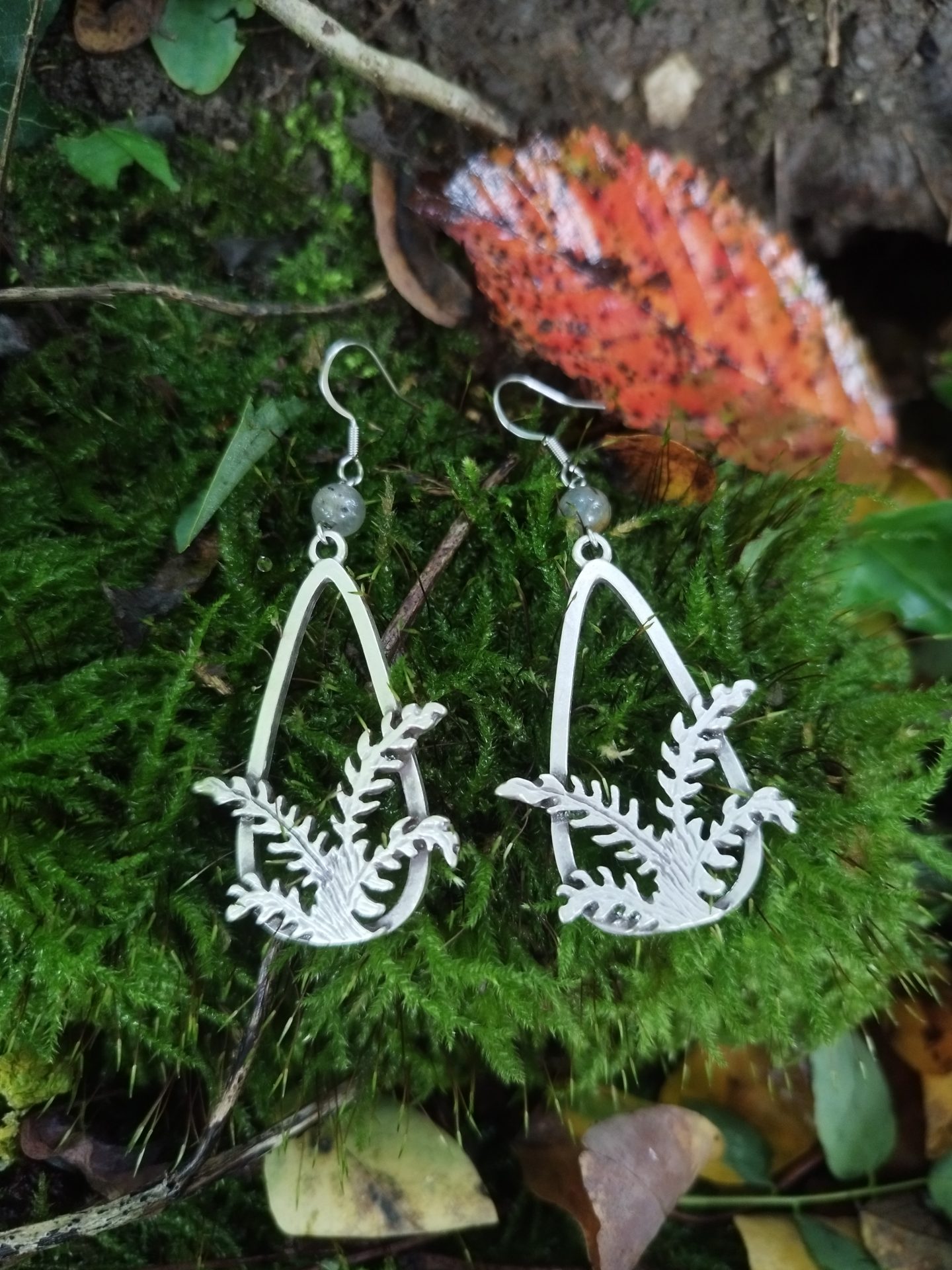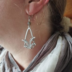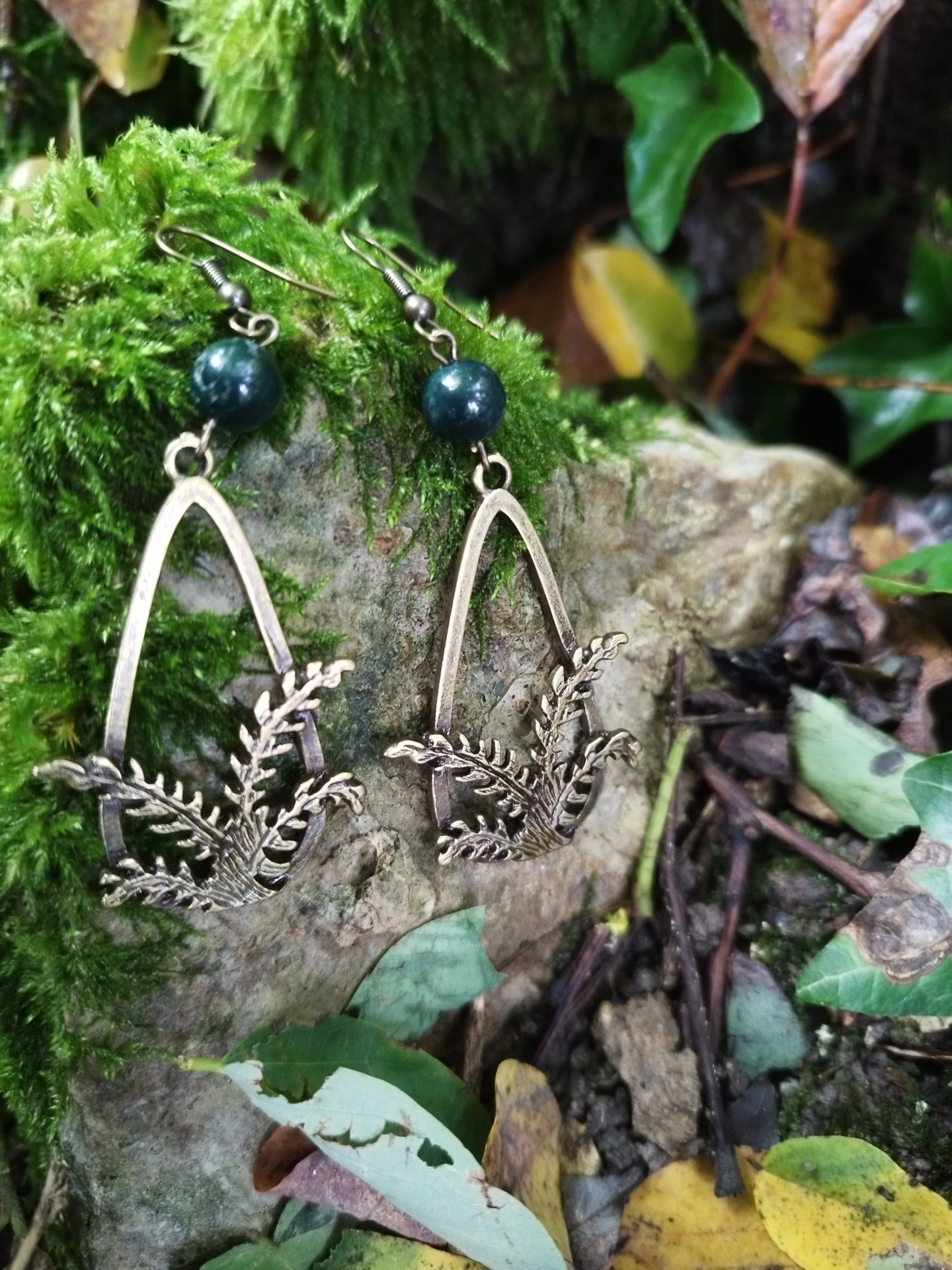 Les boucles d’oreilles sont montées avec des pendentifs en feuilles de fougère et ses jolies perles en agate mousse pour la version bronze et labradorite pour la version argent ou autre sur commande.