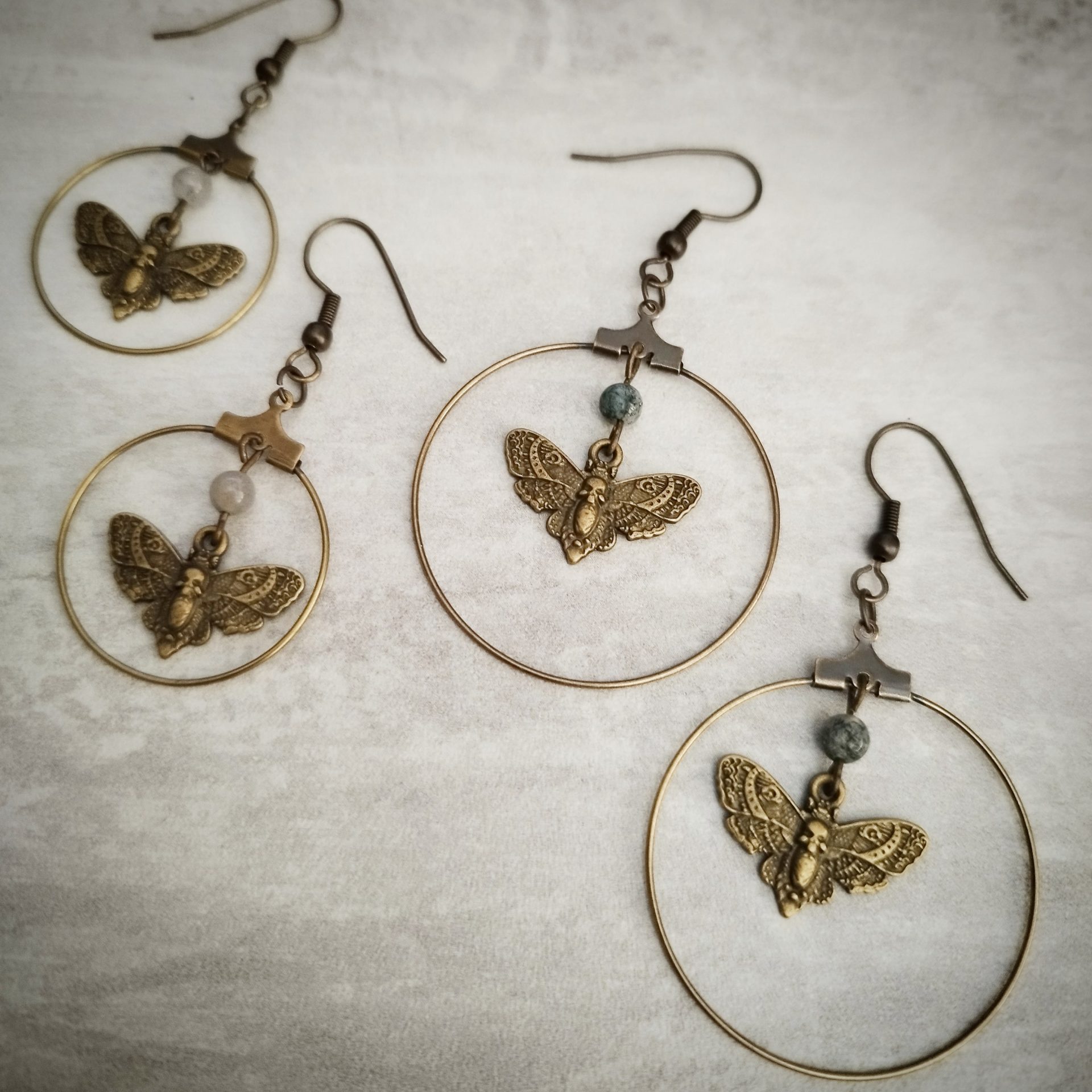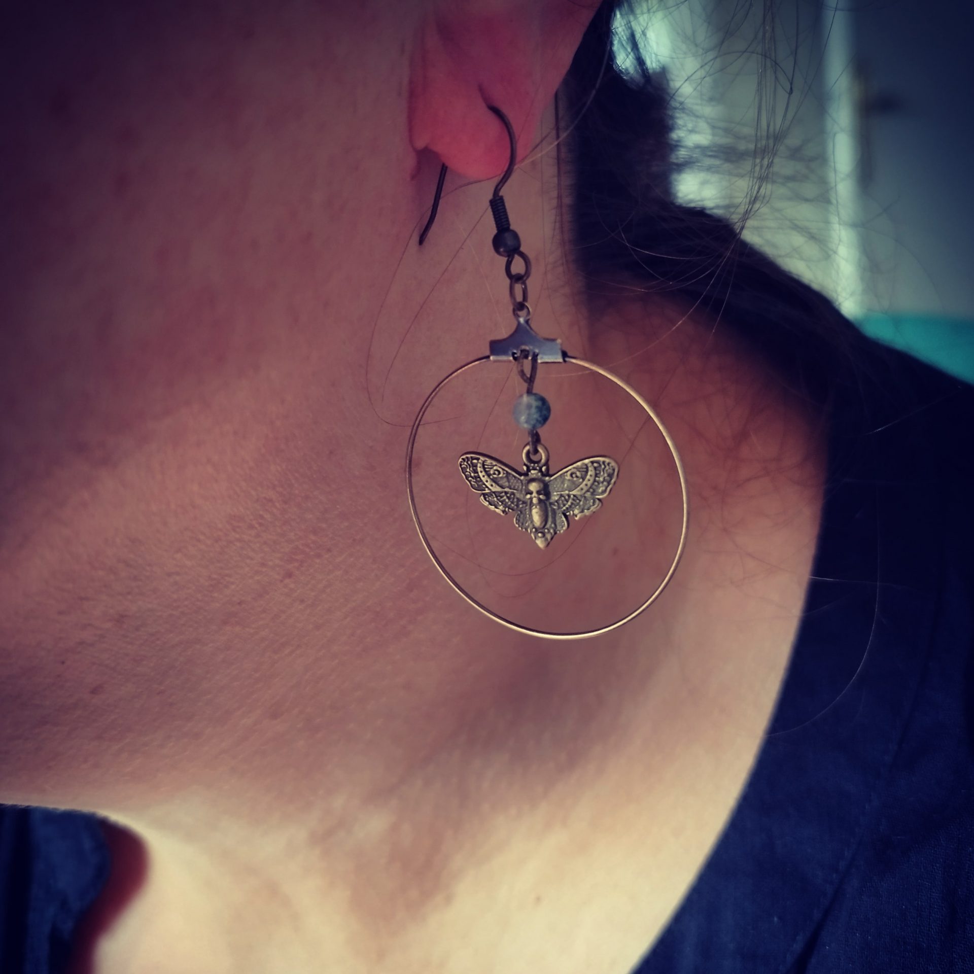 Inspiration folklorique pour ces boucles d’oreilles papillon bohème, avec des cercles (deux diamètre disponibles) façon créoles et des petites perles en pierre (labradorite ou agate mousse).
