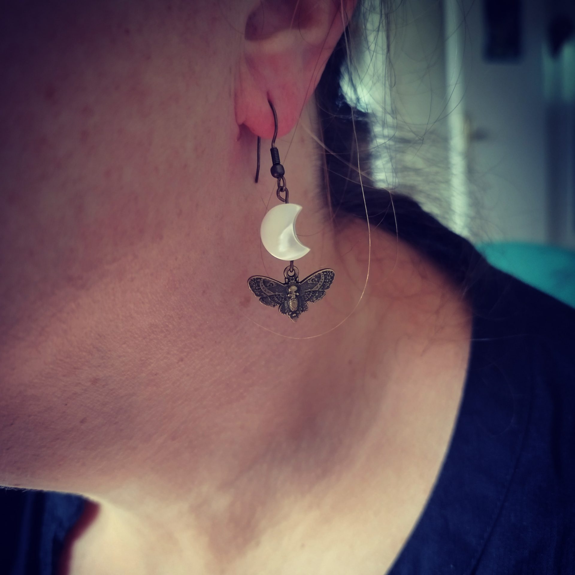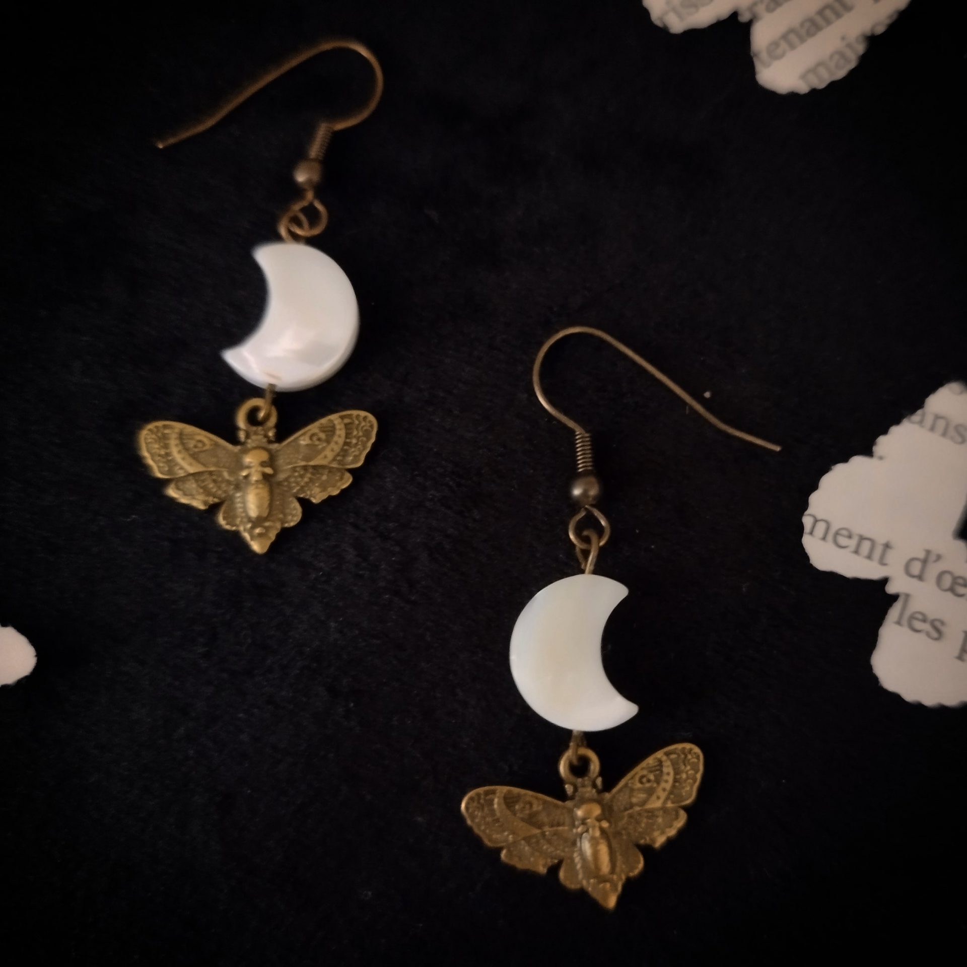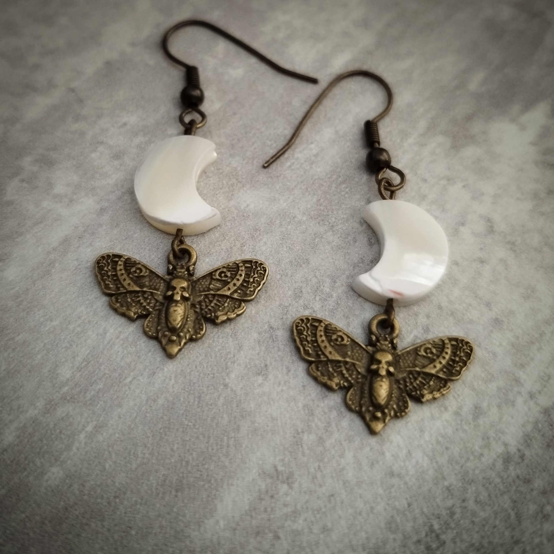 Inspiration nocturne pour ces boucles d’oreilles papillon lune « Nuit de Nacre », avec de jolies perles lunes en nacre et un papillon Sphinx tête de mort couleur bronze.