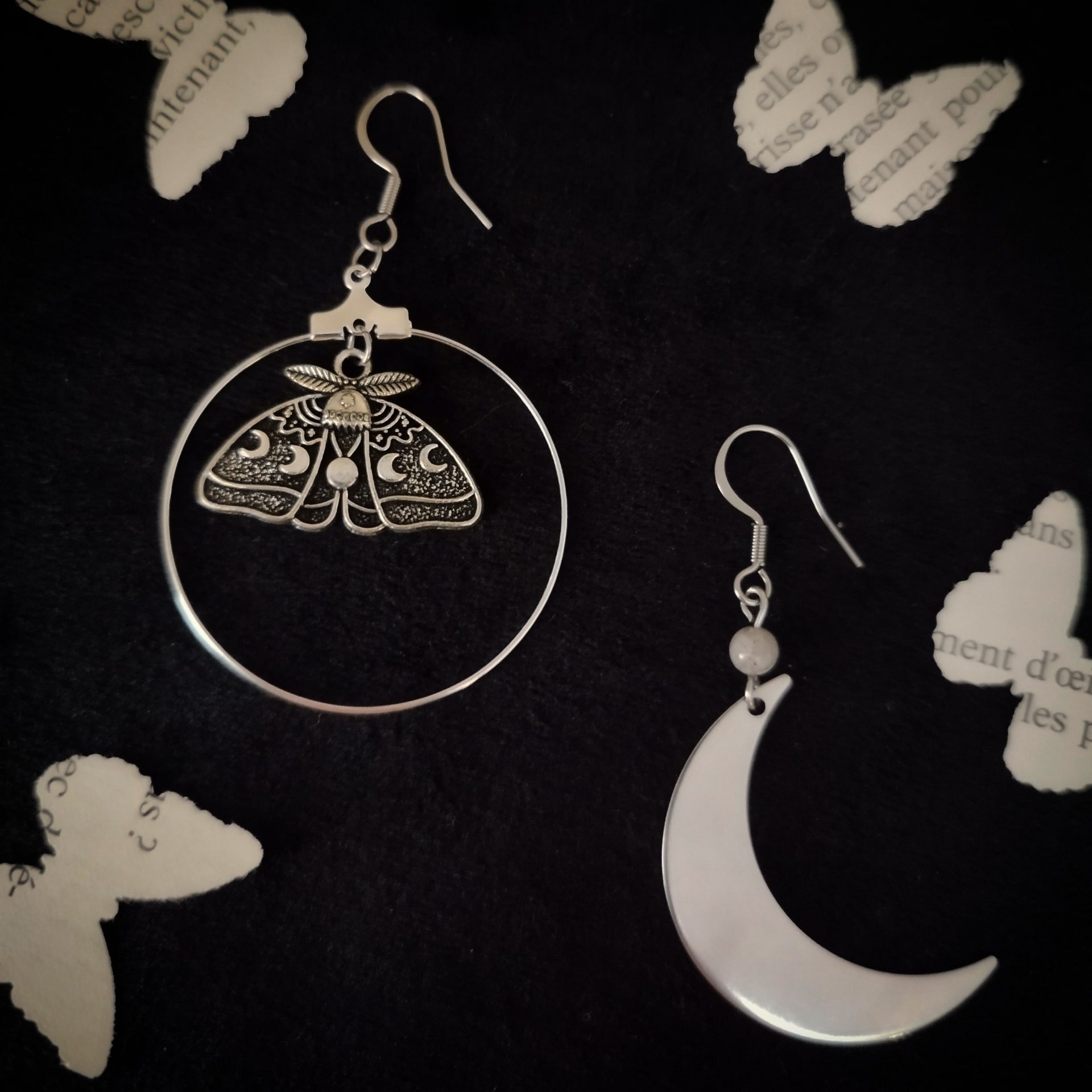 Un papillon de nuit à motifs de lune, et une jolie lune composent cette paire asymétrique.