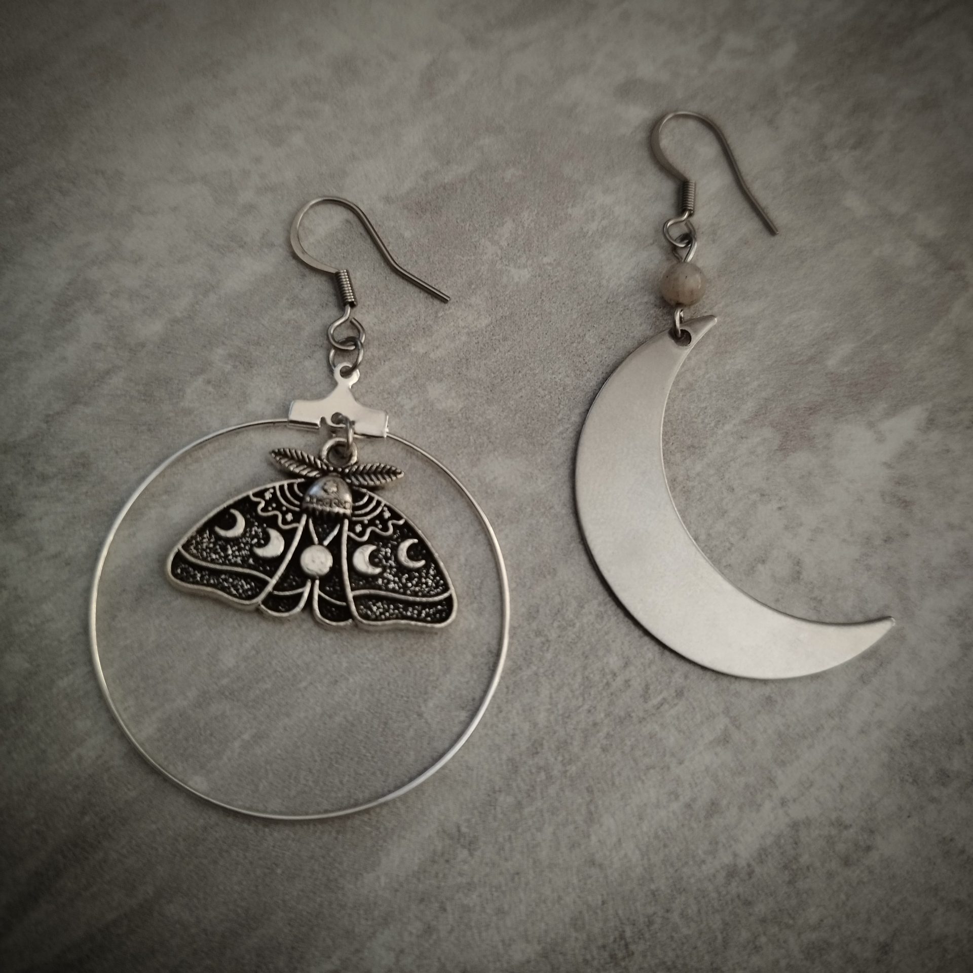Leur asymétrie leur donne un porté original, une jolie lune et pierre de lune d’un côté, et une créole papillon de nuit de l’autre !