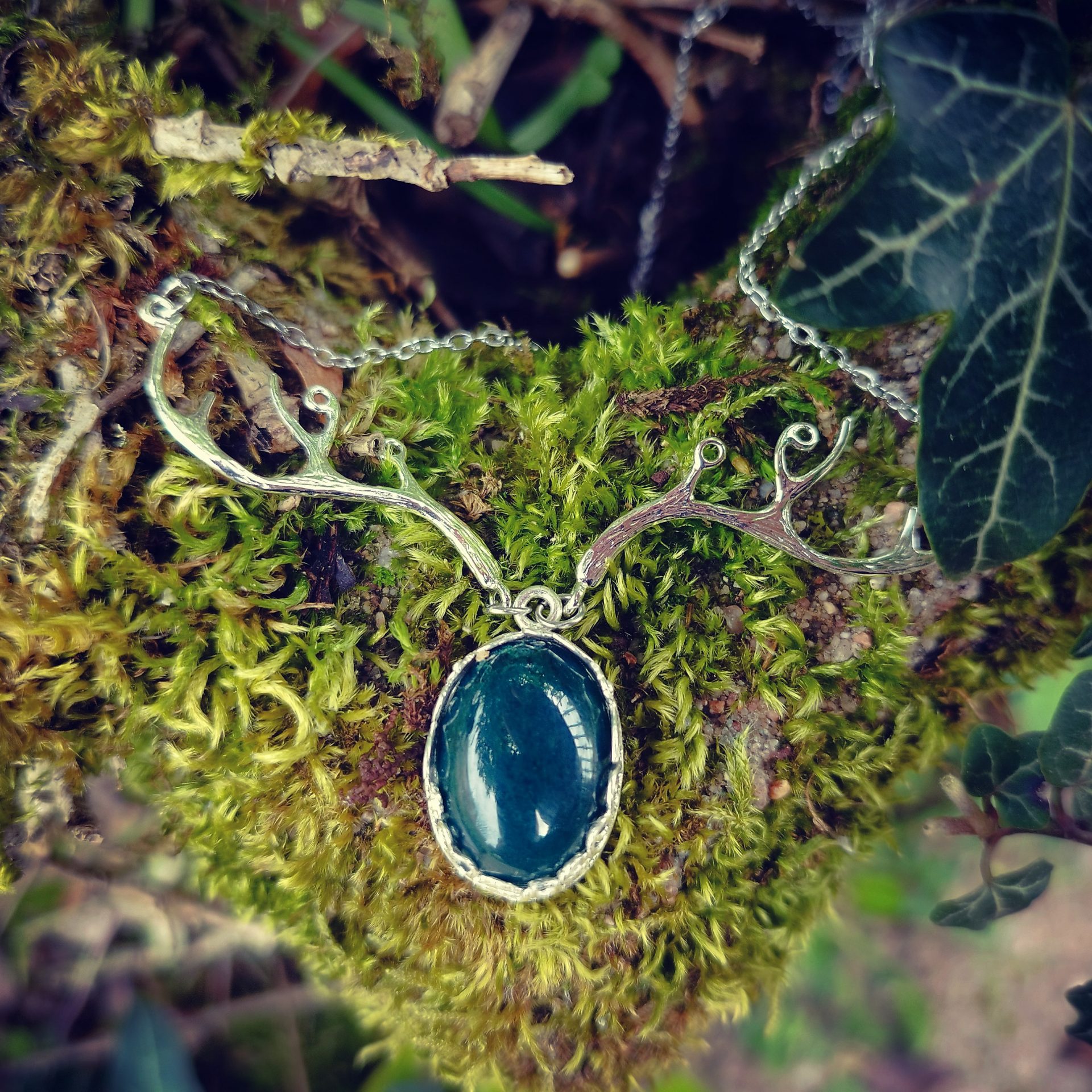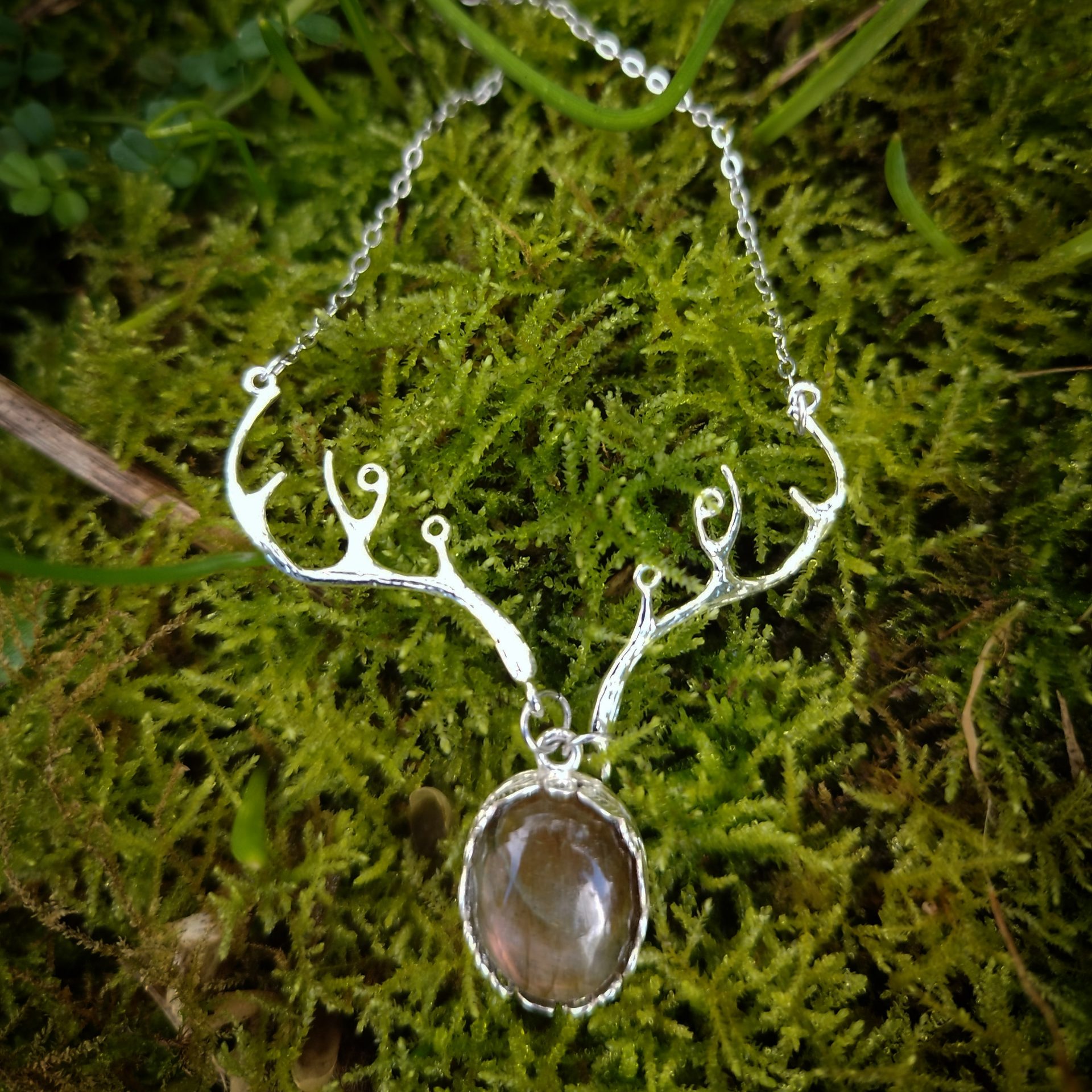 Voici Roi de la Forêt, un collier avec des bois de cerf et un joli cabochon en labradorite.