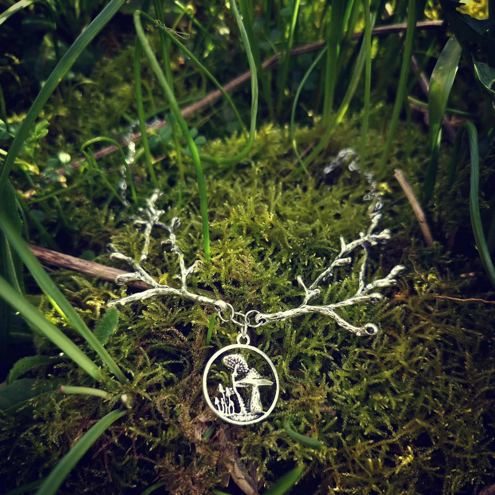 Le collier est monté avec des branches en métal plaqué de d’environ 5 cm, avec un fermoir et une chaîne en laiton (version bronze) ou en acier inoxydable (version argentée). Le pendentif cercle de champignons mesure environ 1.5 cm de diamètre .