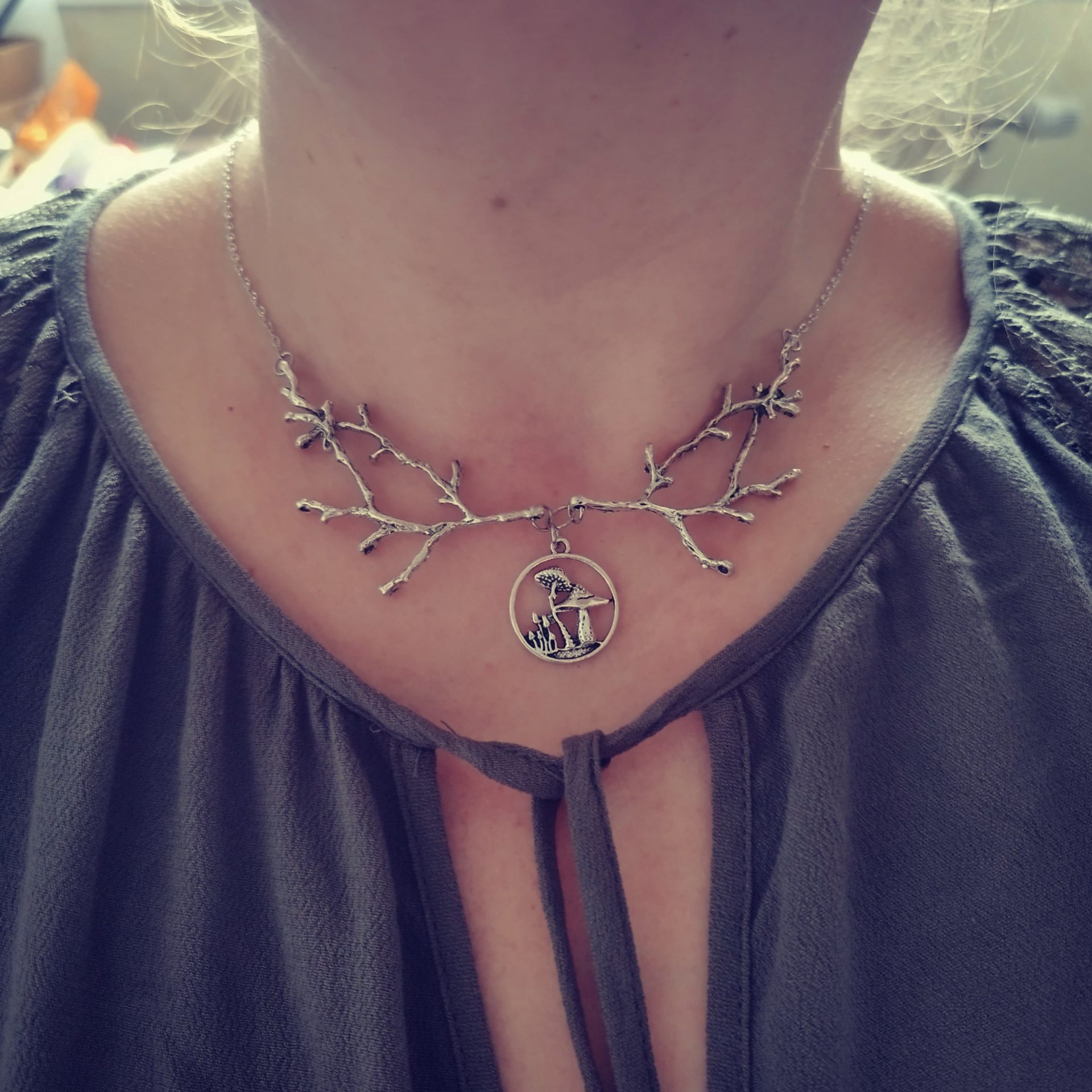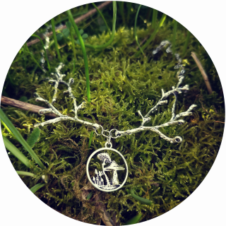 Voici le collier Champignons des Bois, les branches se déclinent ici avec un cercle de champignons.