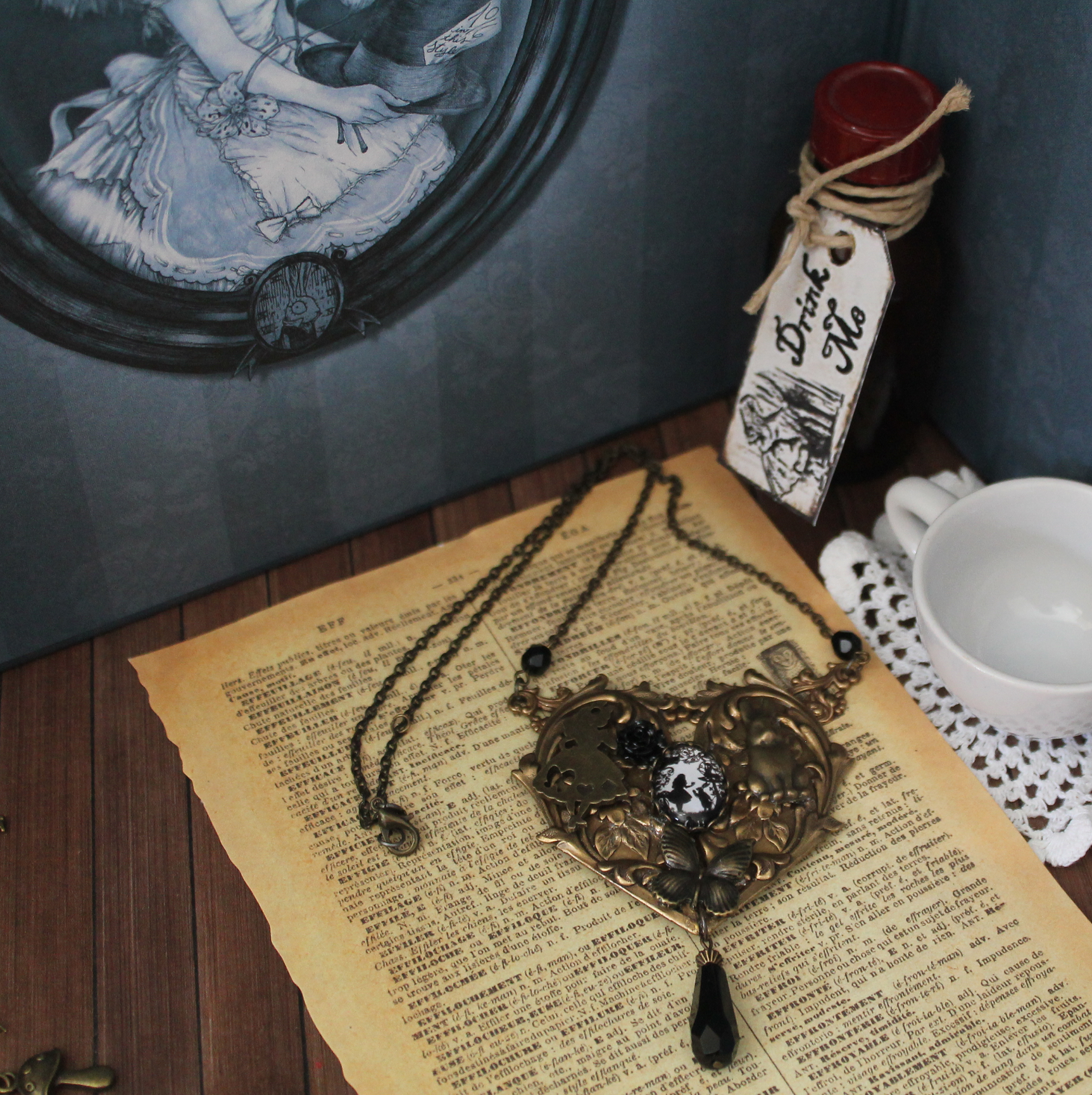 Voici donc le collier Cœur des merveilles avec sa magnifique estampe en forme de cœur d’inspiration XIXe siècle qui sert de base pour les éléments de l’univers du Pays des merveilles : le lapin et Alice.