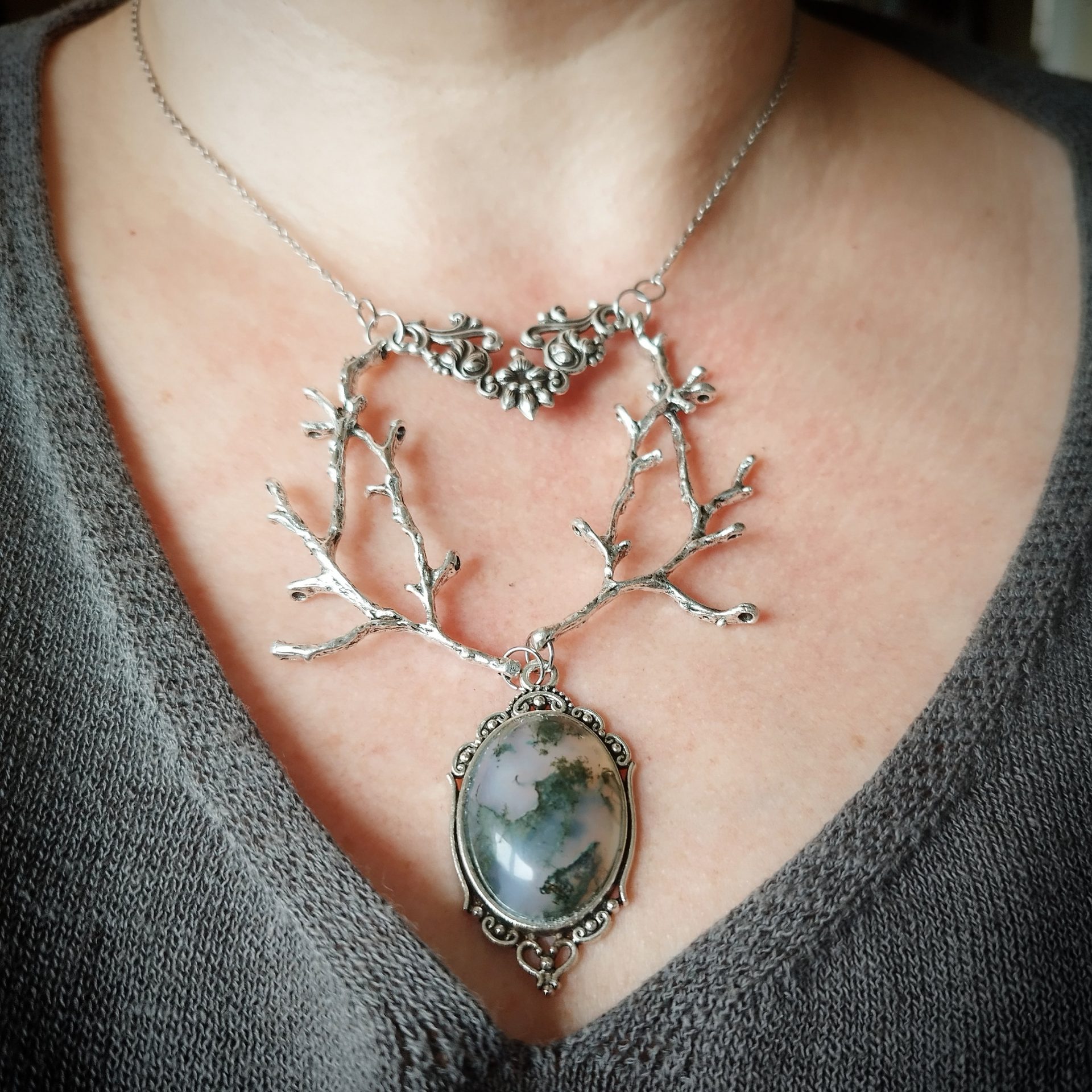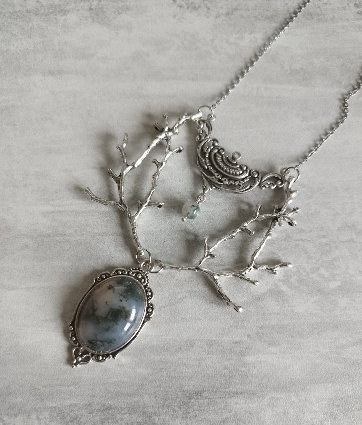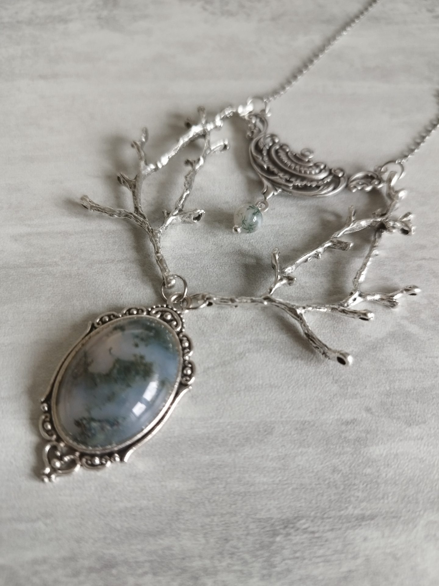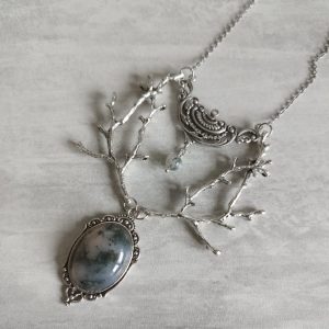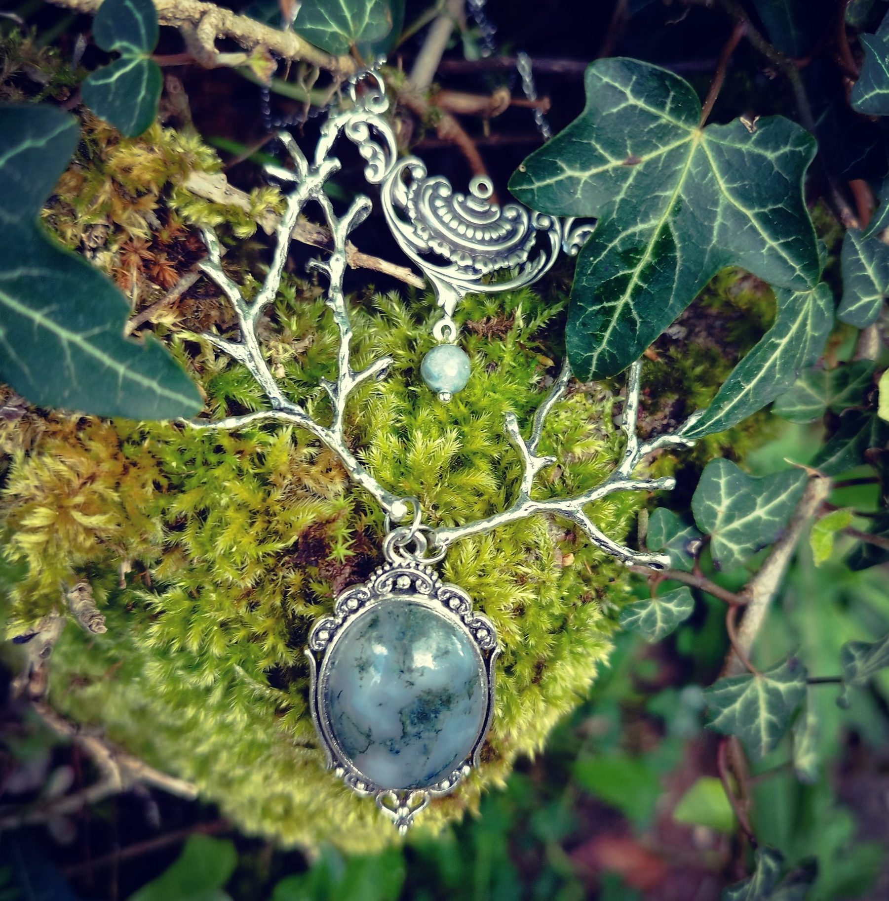 Voici le collier Forêt énigmatique, les branches se déclinent ici avec un médaillon en pierre naturelle et une magnifique estampe centrale.
