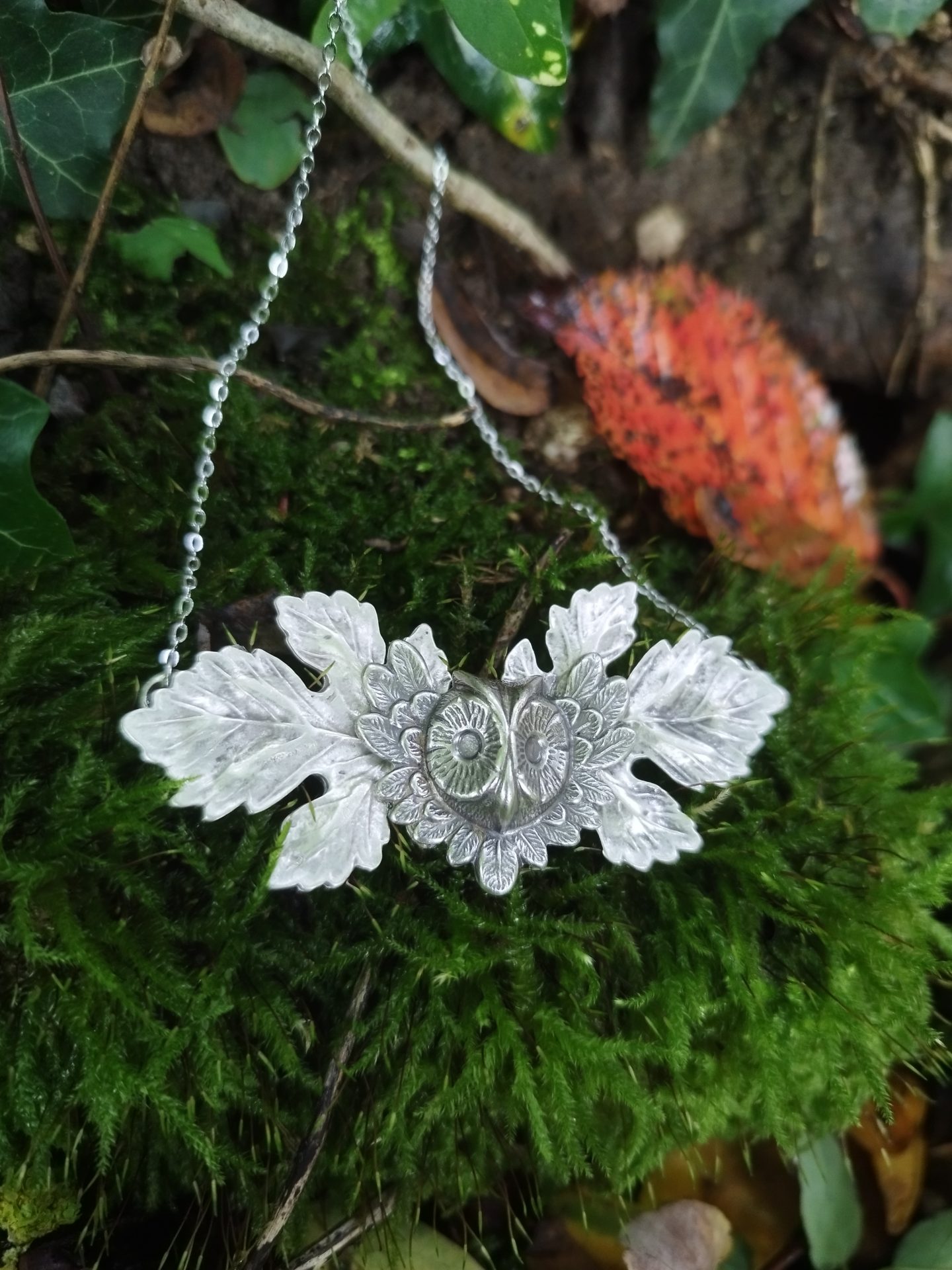 Le collier est formé de délicates feuilles où sont fixées une estampe hibou, tout en laiton plaqué argent.