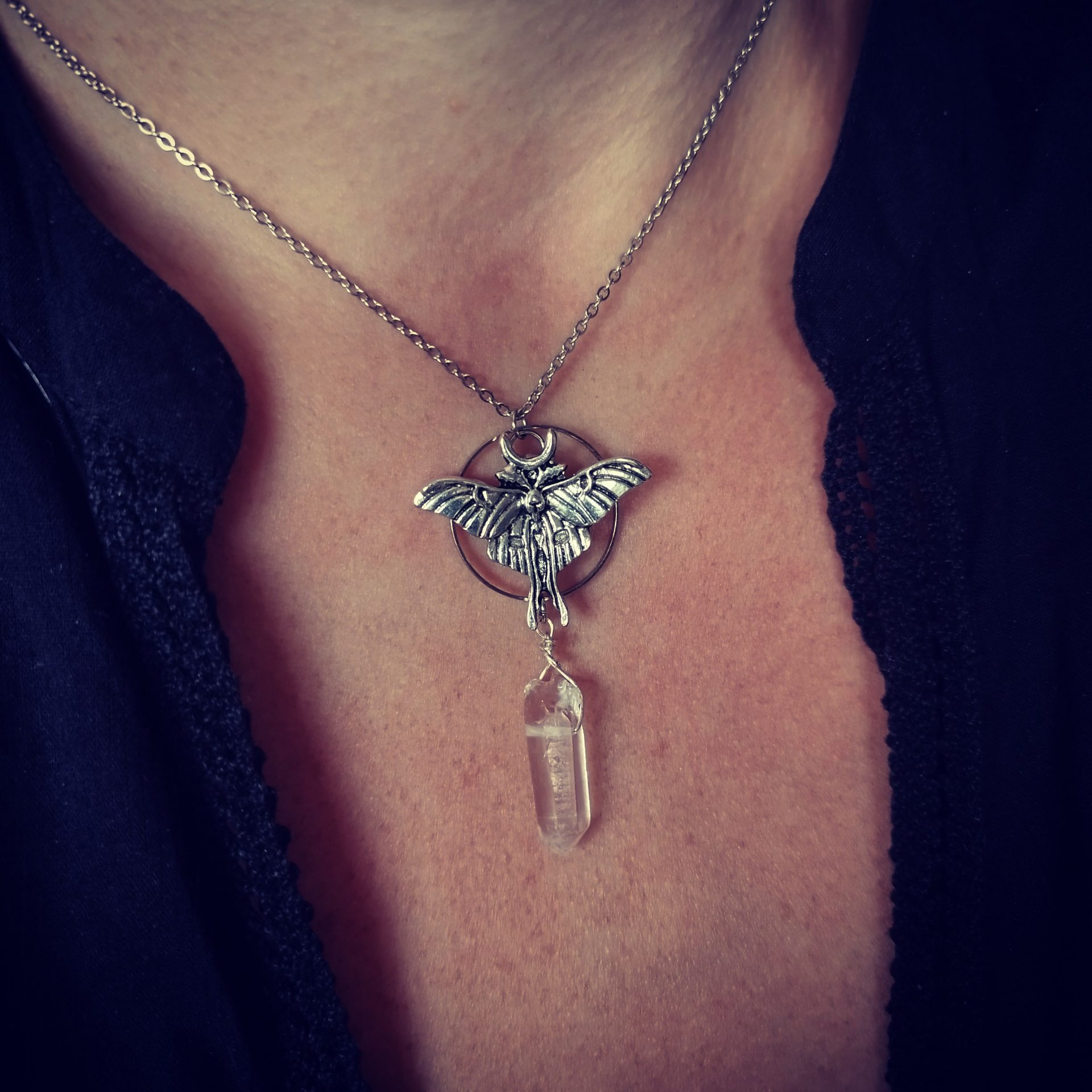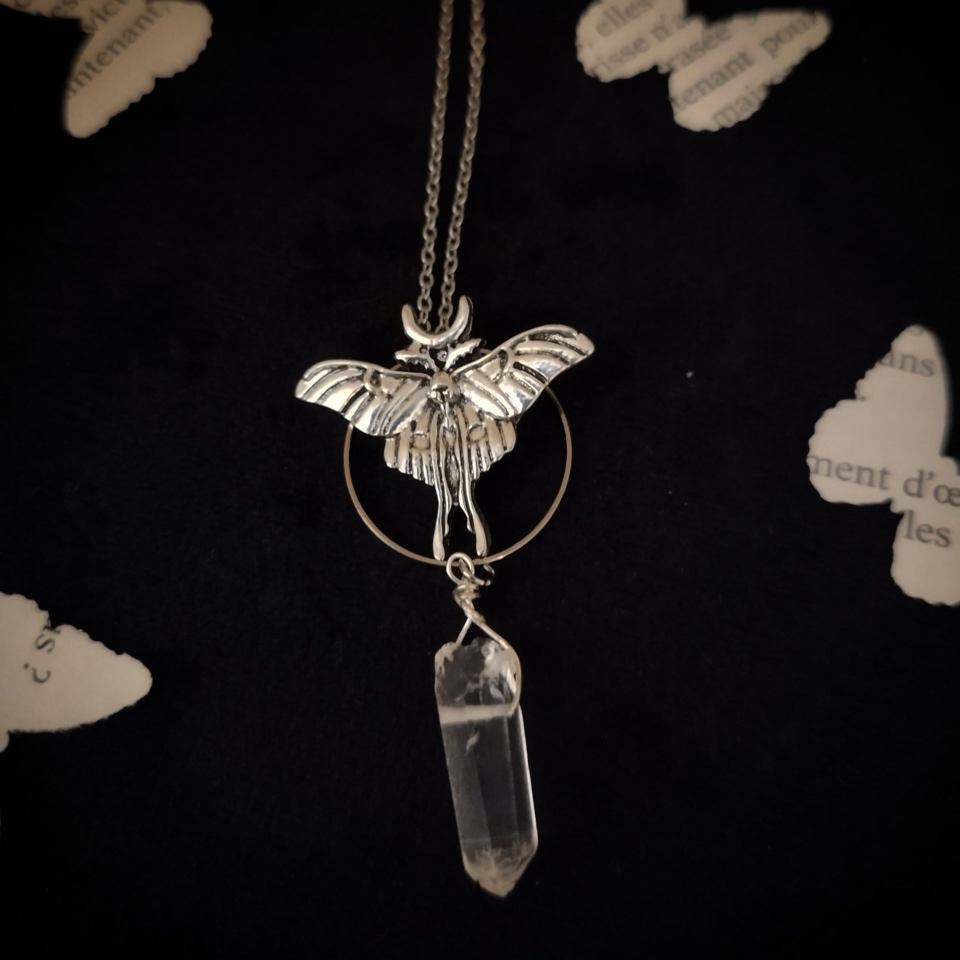 Le pendentif papillon mesure environ 3 cm de haut et 3 cm de large est fixé sur un cercle de 25mm de diamètre. Un joli cristal de roche (quartz) d’environ 235 cm de long est suspendu.