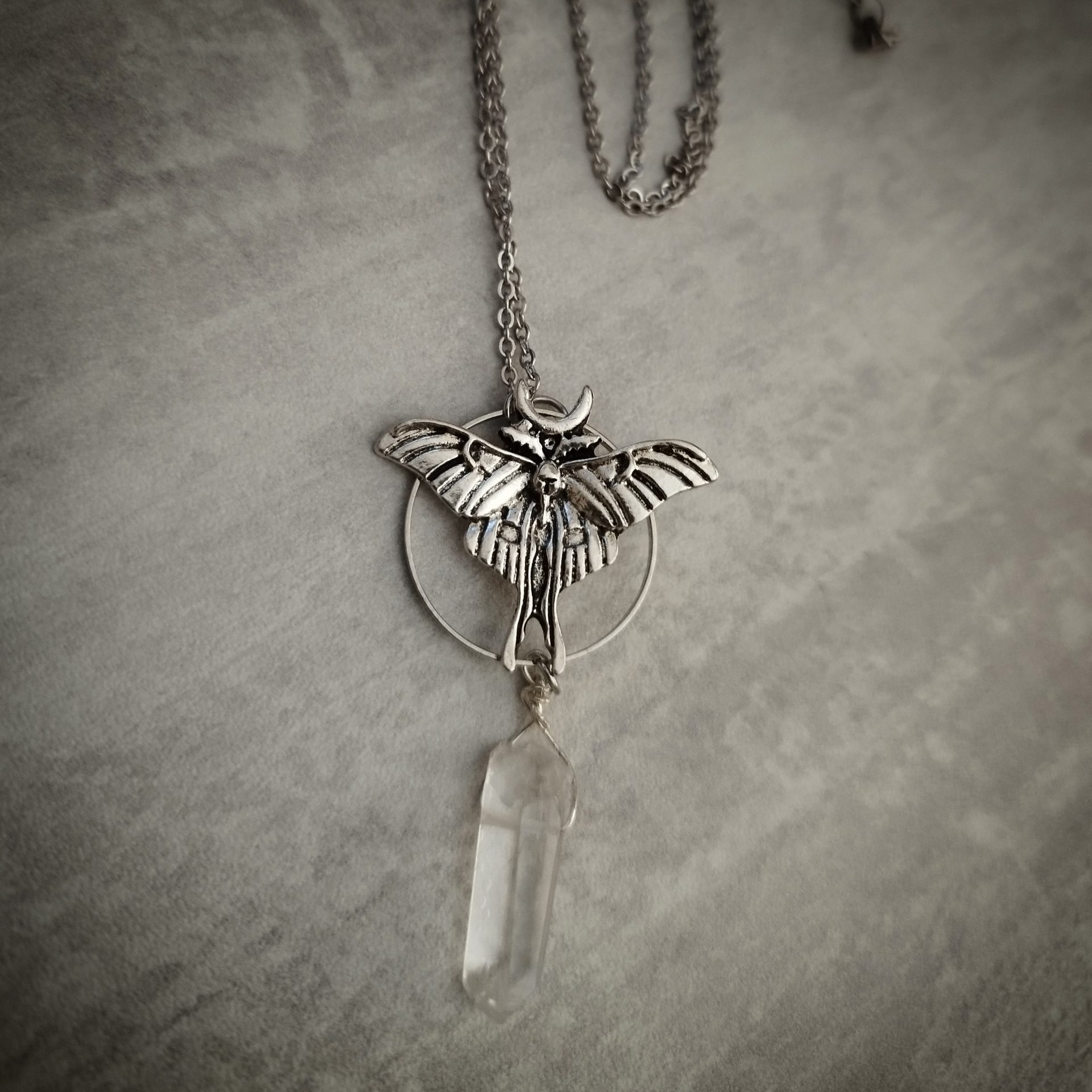 Un papillon de lune avec un cristal suspendu, à porter avec les boucles d’oreilles Papillon de Lune