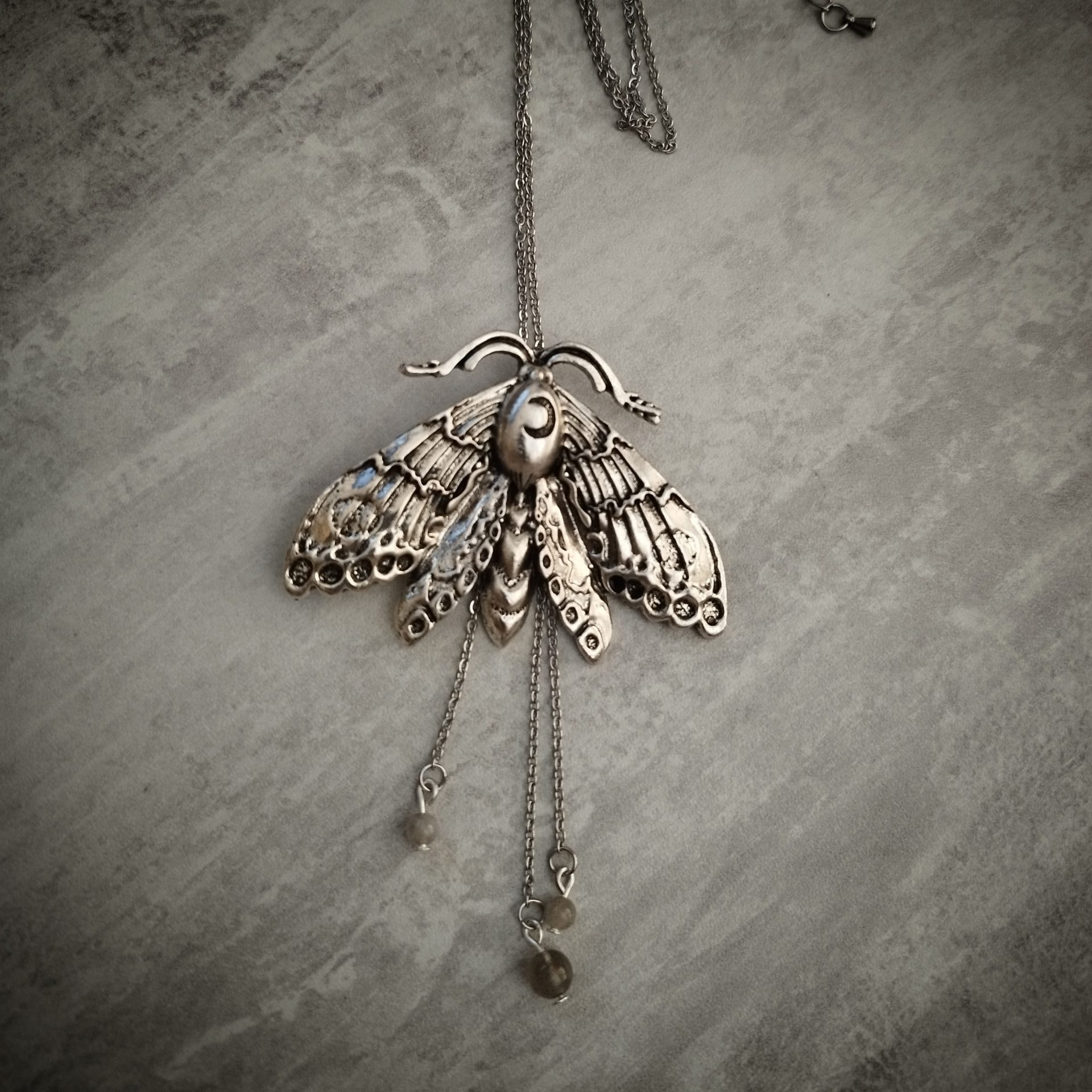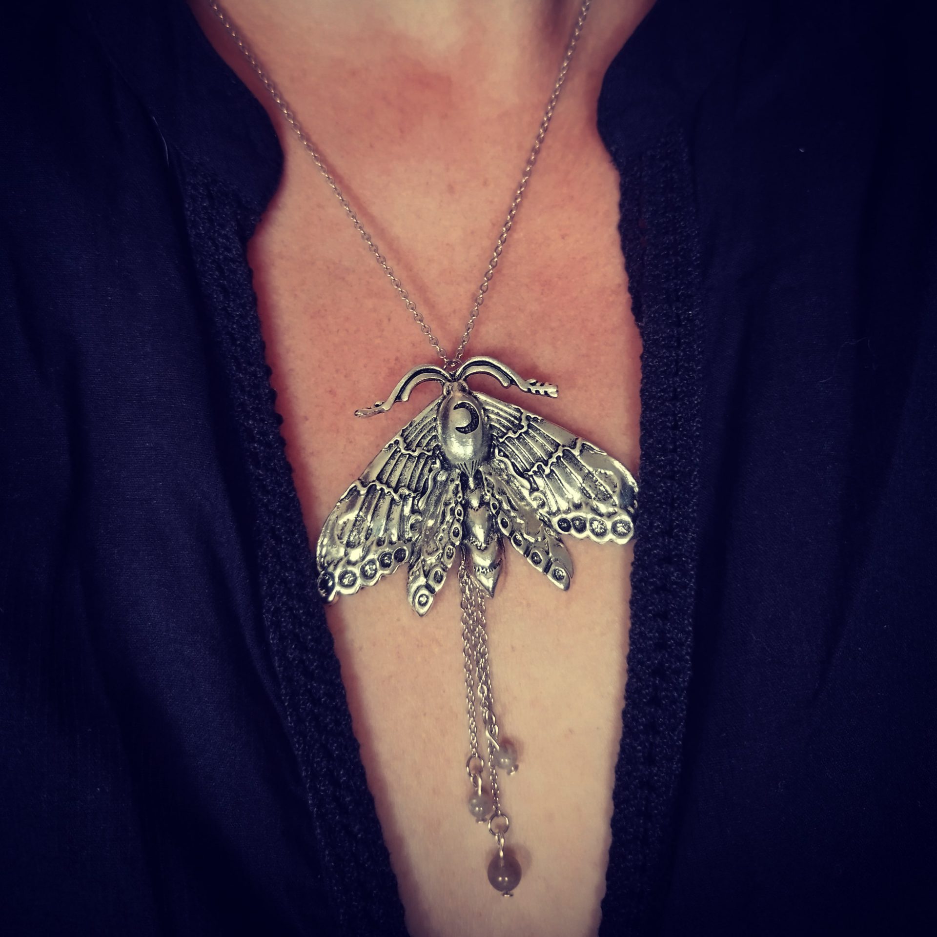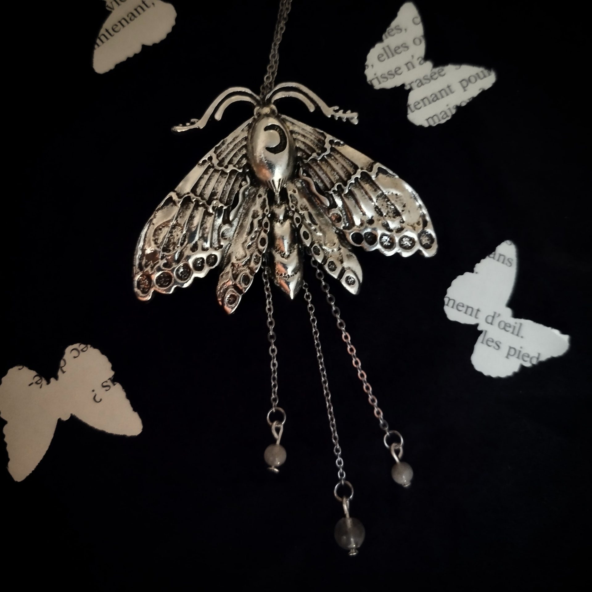 Le collier Papillon de Nuit, majestueux avec le grand pendentif papillon détaillé, avec une lune gravée sur le thorax.
