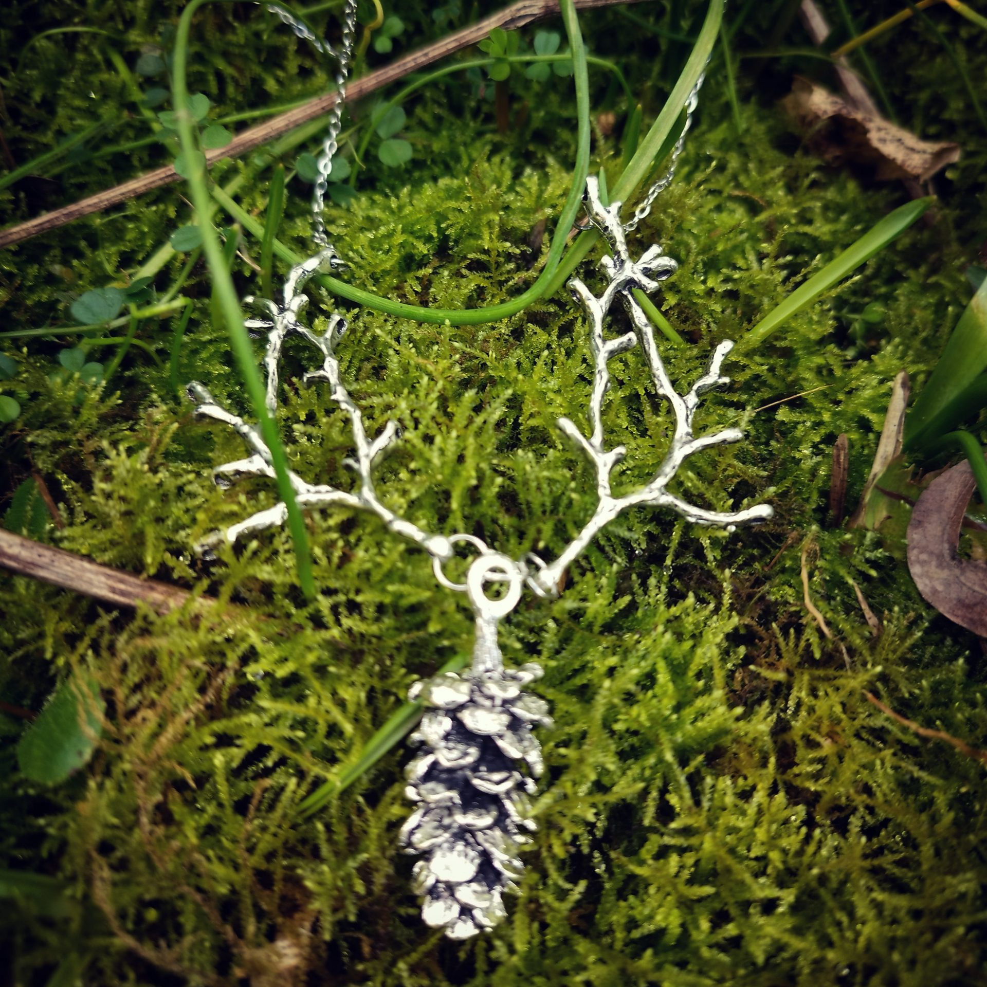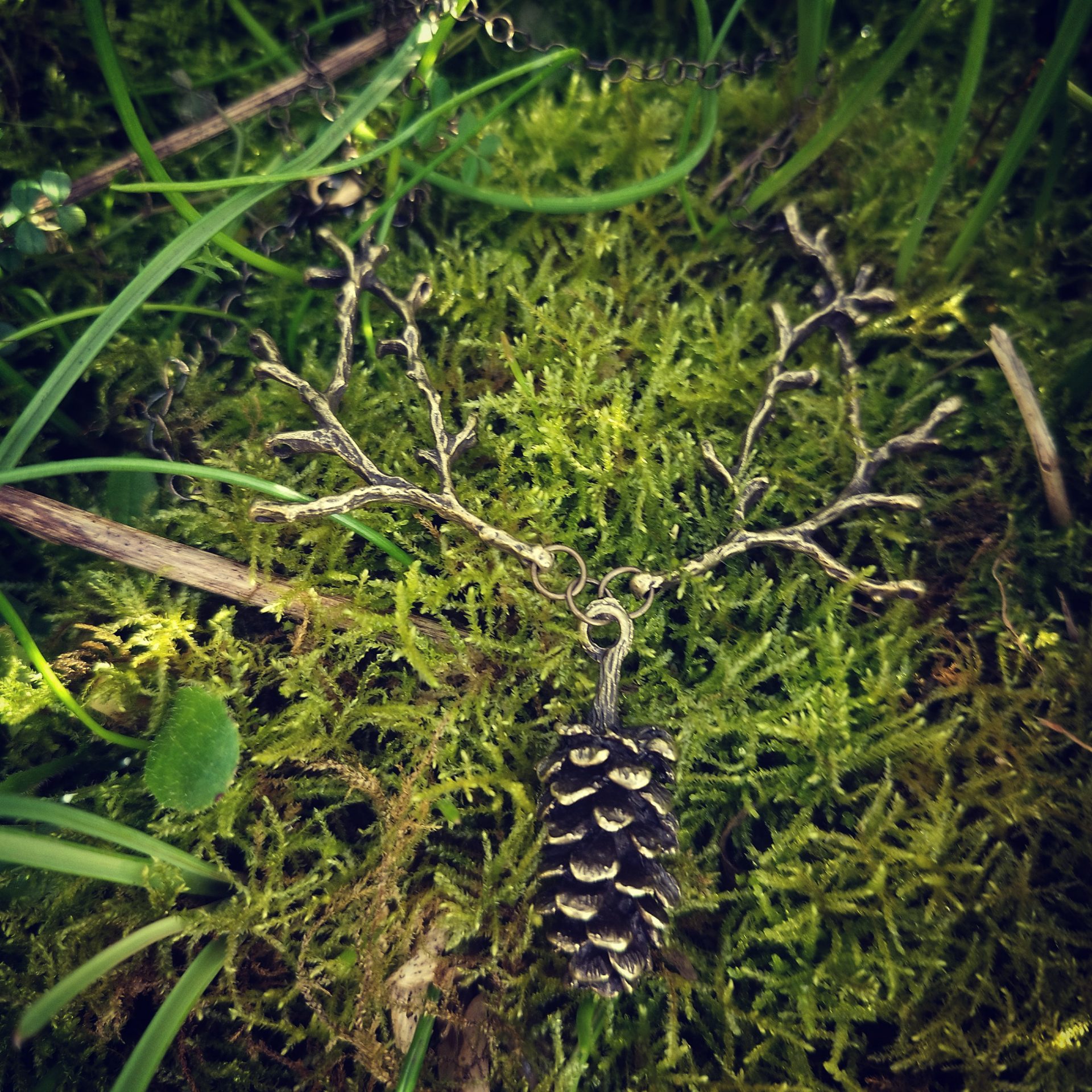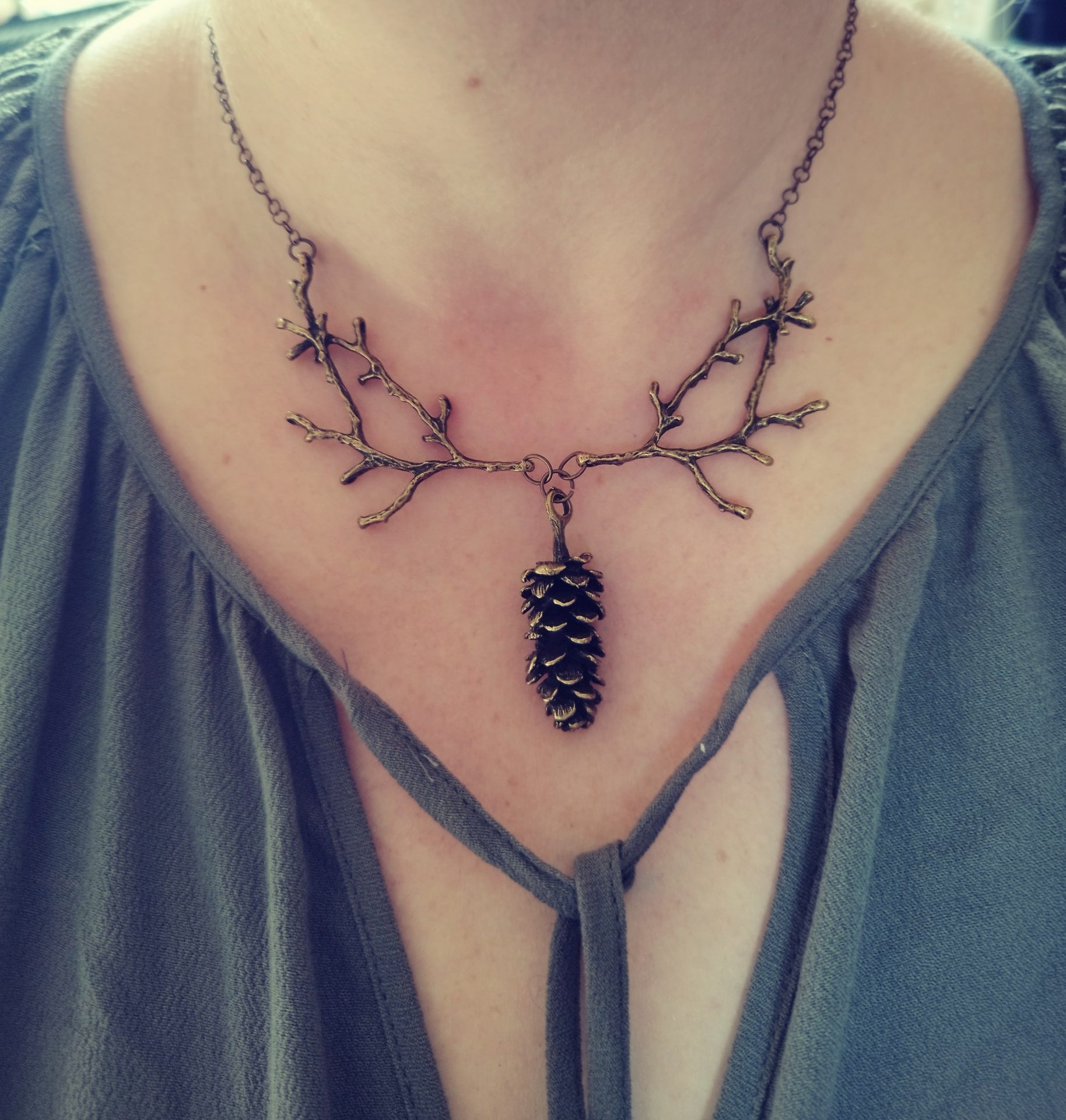 Voici le collier Forêt profonde, les branches se déclinent ici avec une pomme de pin, en bronze ou argenté.